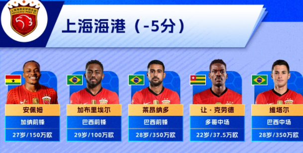 上海海港五外援:安佩姆150万欧,莱昂纳多、维尔塔均为350万欧,加布里埃尔100万欧,克劳德37.5万欧,总身价为987.5万欧